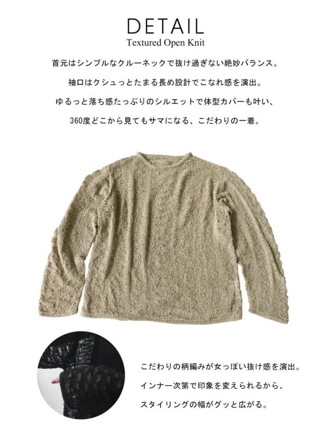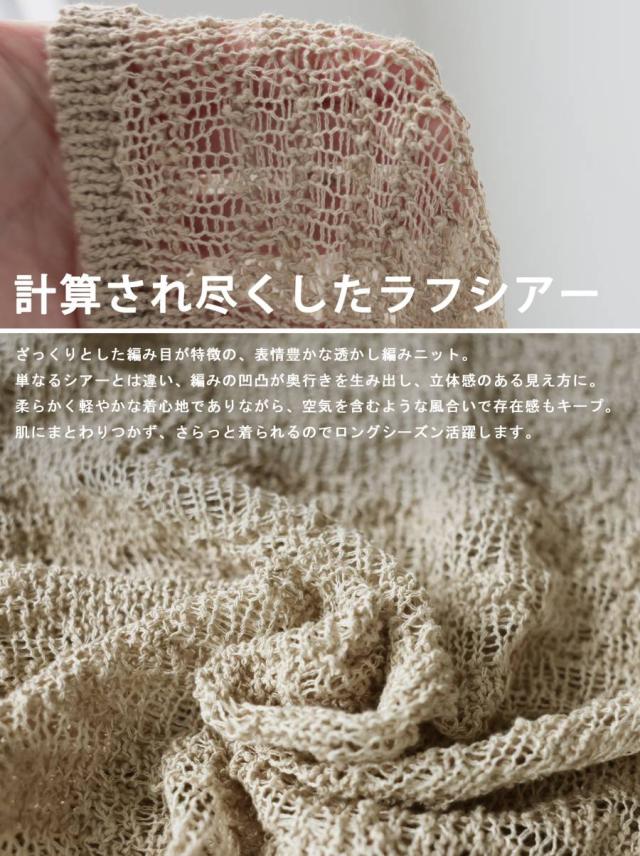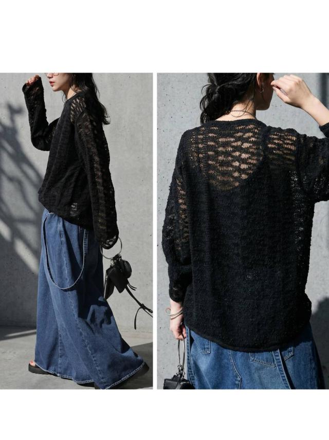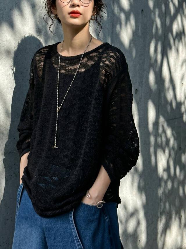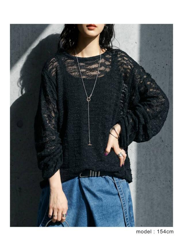 透け感のあるシアーな編み柄が軽やかな風合いを演出し、デザインニットとして一枚でも映える存在感。