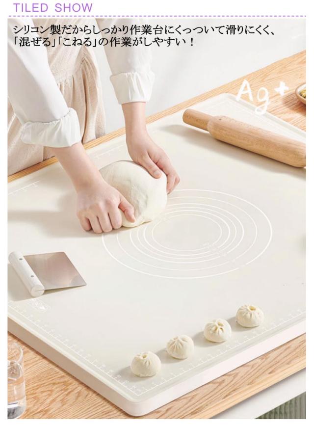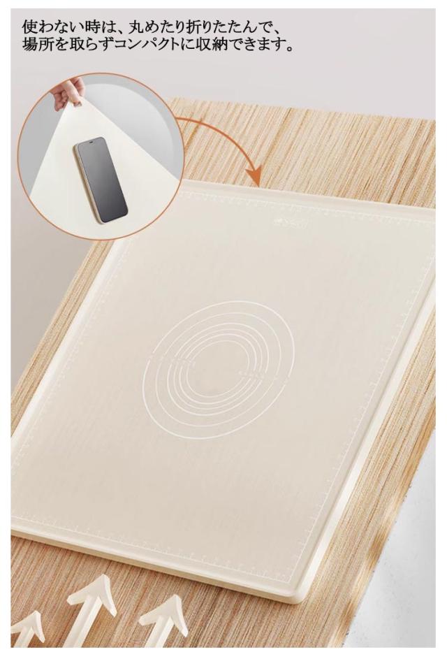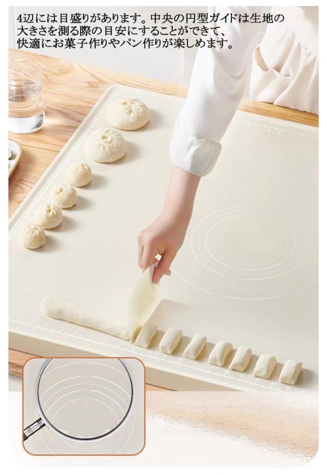 | 目盛り付き作業しやすいシリコンマット シリコン製だからしっかり作業台にくっついて滑りにくく、「混ぜる」「こねる」の作業がしやすい! 4辺には目盛りがあります。中央の円型ガイドは生地の大きさを測る際の目安にすることができて、快適にお菓子作りやパン作りが楽しめます。 食品グレードシリコン素材、食材は直接に触れることも安心。 洗って何度も使えるから、とっても経済的。使い終わったら丸洗いできるのも嬉しいポイント♪ 使わない時は、丸めたり折りたたんで、場所を取らずコンパクトに収納できます。 | |