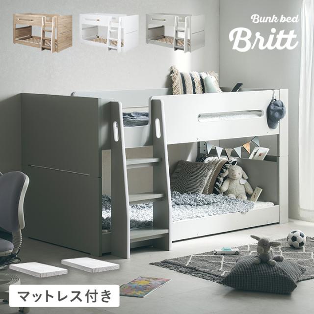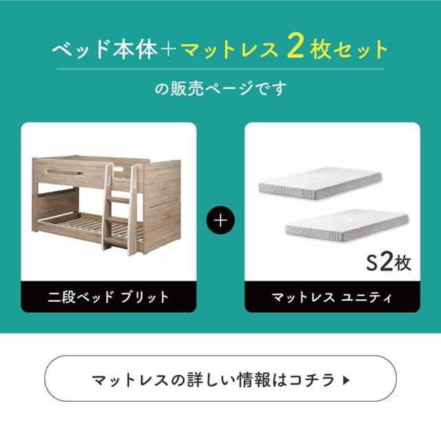 二段ベッド 2段ベッド ベッド 子供 大人用 ロータイプ コンパクト 分離 分割 木製 宮付き 宮棚 Sサイズ マットレス 2枚セット おしゃれ コンセント付き Britt(ブリット)+Unity(ユニティ) 3色対応