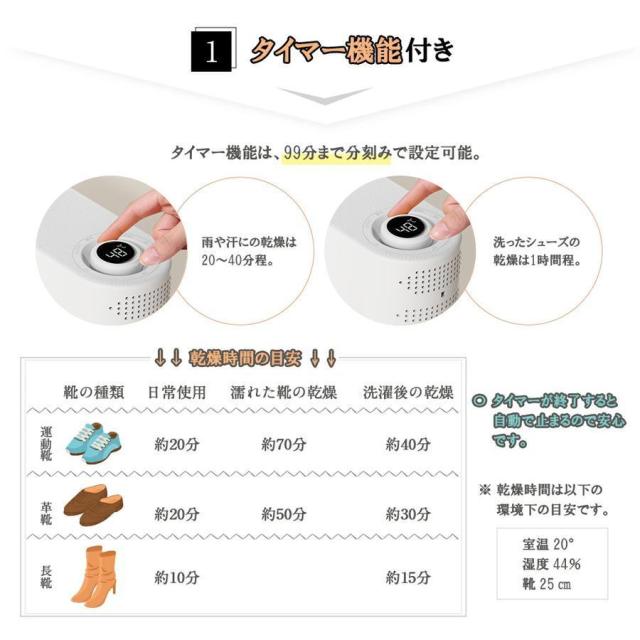 0〜120分まで設定できるタイマー付き。用途や靴の状態に合わせて時間を調整でき、使用後は自動停止するので安心・安全です。