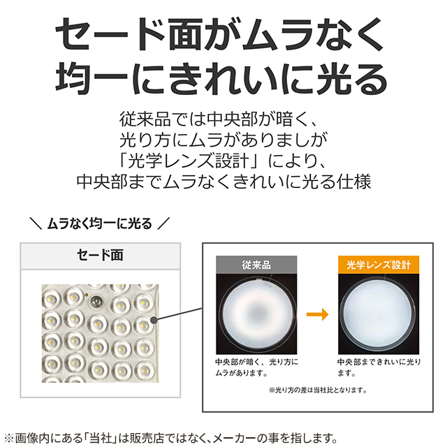従来品では中央部が暗く、光り方にムラがありましたが、光学レンズ設計品では、中央部までムラなくきれいに光ります。