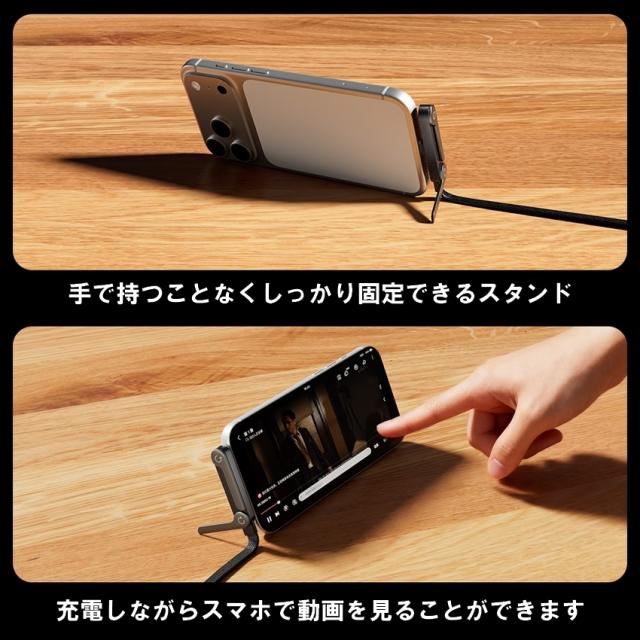 充電ケーブルのコネクタ部分にスタンドになるギミックを搭載しています。
