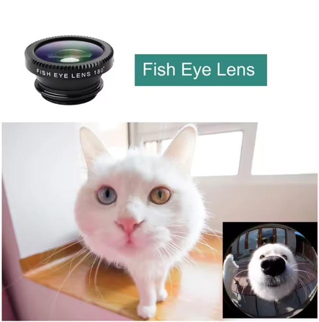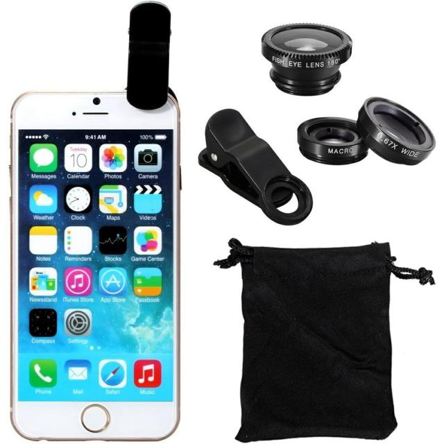 魚眼、接写、ワイドの3種類のレンズがセット! 持ち運びに便利な収納袋も付属!