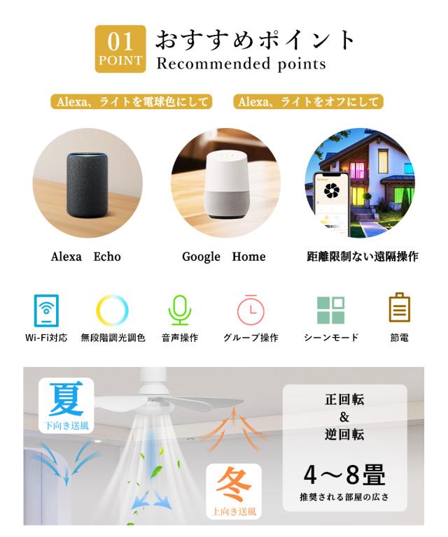 - 操作方法は多様で、音声操作(Amazon Alexa/Google Assistantなど対応)、リモコン操作、スマホ制御(Tuyaアプリ)、遠隔操作に対応しており、離れた場所からでも快適に制御できます。外出中でも「オン・オフ」「タイマー設定」「風量無段階・ledライト無段階調光調色」が可能。