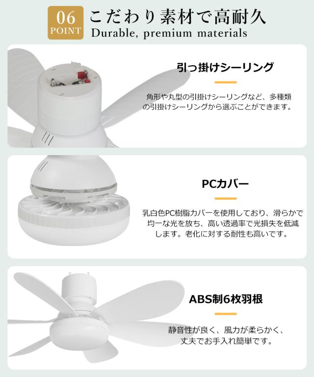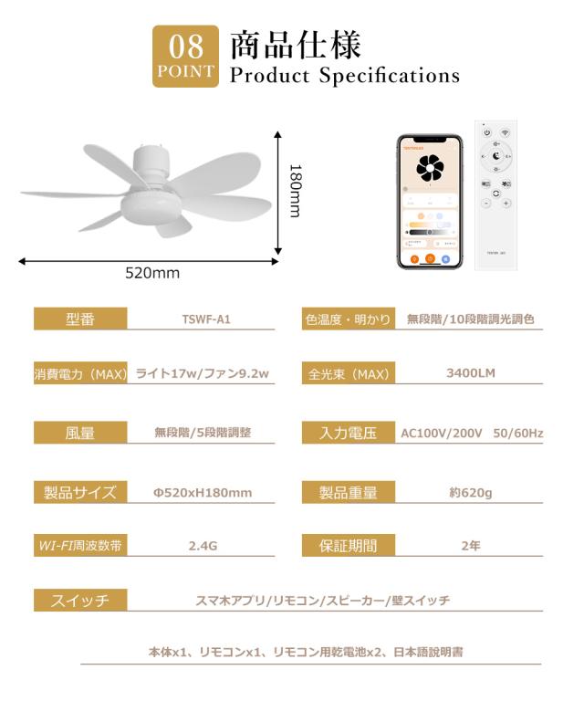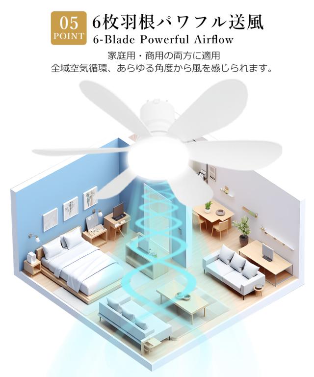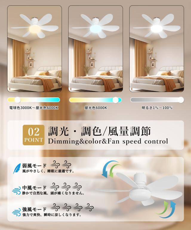 - ?無段階調光調色:3000K〜6000Kの色温度調整と1%〜100%の輝度調節で、リビングの集中作業からベッドルームのゆったりとした雰囲気まで、シーンに合わせた光環境を自在に作成可能。 ?無段階風量調整:静かな微風から強風まで無段階調節し、季節・体調に合わせた快適な風量をカスタマイズできる。(スマホで風量無段階調整/リモコンで風量5段階調整)