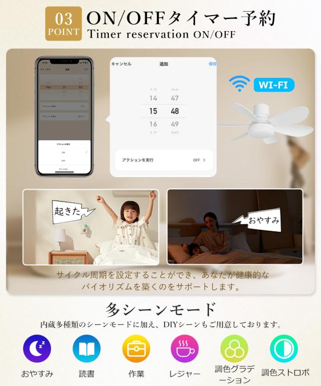 - この革新的な製品は、「ファン」と「LEDライト」を融合しており、天井に設置するだけで、涼しい風と明るい光を同時に享受できます。夏は強力な送風で暑さを和らげ、冬は空気循環を促して暖房効果を高めます。高い循環効率で温度差を解消可能です。照明と換気の両方を一つの製品で解決できるLEDファンライトは、あなたの生活を快適にアップグレードします!