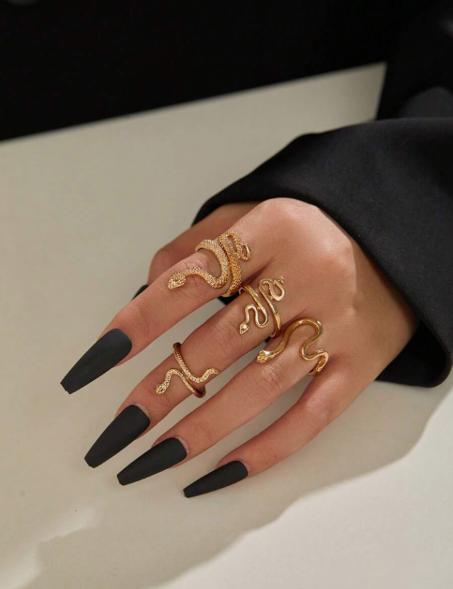 【4点セット】ミニマリスト スネークリング|冷たい金属の質感が美しい 繊細なヘビモチーフ レイヤードリングの決定版