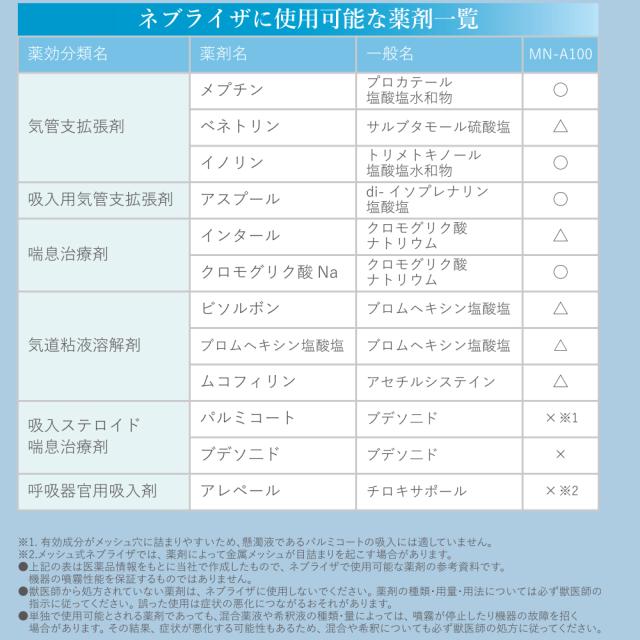 ・使用可能液:【医師が処方する薬液】メプチン、イノリン、アスプール、クロモグリク酸Na、生理食塩水など