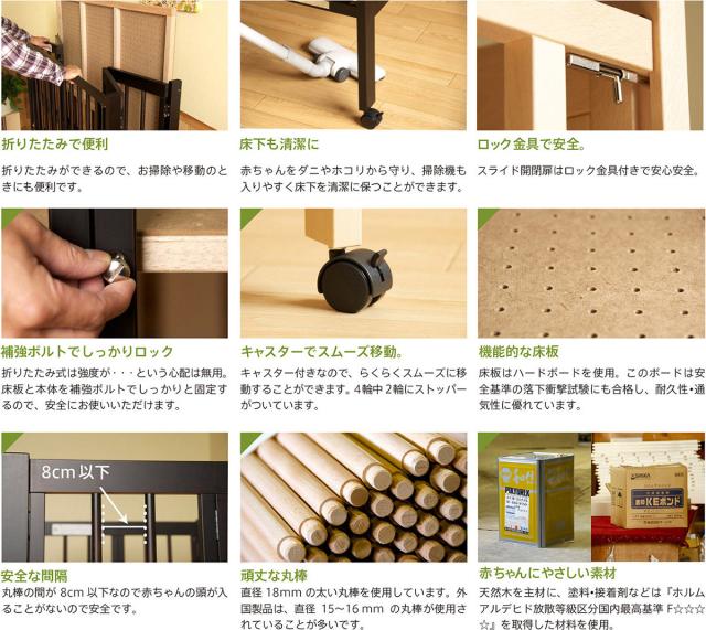 | 特 徴 | ・ワンタッチ折りたたみ式 ・扉スライド式 ・4輪キャスター付 ・床板2段階調節可能(床から672、404mm) ・耐荷重 ベッド:静止状態で60kg (生後24ヶ月以内の乳幼児が対象です。同時に二人で使用したり、腰掛けたり、ぶら下がったりしないでください。) ・生産国:日本 |