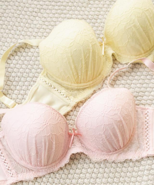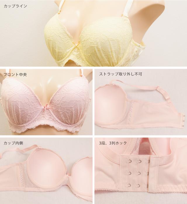裏地無し、透け感有り、伸縮性有り 【カップタイプ】3/4カップ・モールドカップ(丸みを形成した厚みのあるカップです)、【ホックの数】三段三列、【パット付属】なし、【パットポケット】なし、【ストラップ取外し】可、【ワイヤー】あり、※タンブル乾燥禁止