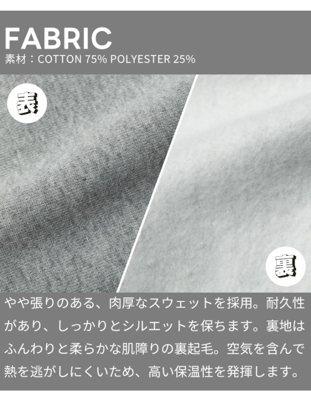 両脇にリブ生地のサイドパネル(リバースィーブスタイル)を採用しており、伸縮性がありアクティブな動きに対応します。 素材はやや張りのある、肉厚なスウェット地。耐久性があり、しっかりとシルエットを保ちます。裏地はふんわりと柔らかな肌当たりの裏起毛。空気を含んで熱を逃がしにくいため、高い保温性を発揮します。 |