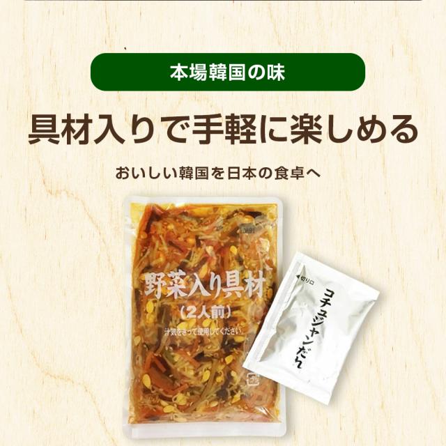 ■賞味期間 : 製造後10ヶ月(未開封) ■原材料名:具材入り調味料[野菜(緑豆もやし(国産)、大豆もやし、にんじん、ひらたけ、きくらげ、たけのこ)、果糖ぶどう糖液糖、砂糖、植物油脂、ごま、食塩、しょうゆ、香辛料/酸味料]、コチュジャンだれ[コチュジャン、香味油、みそ、還元水あめ、食塩、砂糖、ごま油、魚介エキス、にんにく、魚醤、昆布エキス、酵母エキス、ポークエキス、ポークオイル、醸造酢、スルメパウダー、エビパウダー/調味料(アミノ酸等)、香辛料抽出物、甘味料(アセスルファムK)]、(一部にえび・小麦・いか・ごま・さけ・大豆・豚肉を含む)