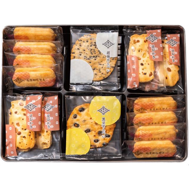 ■商品詳細:あまからせん(2枚入)8袋・胡麻せんべい(1枚入)・黒豆せんべい(1枚入)各3袋・豆おかき(1枚入)4袋