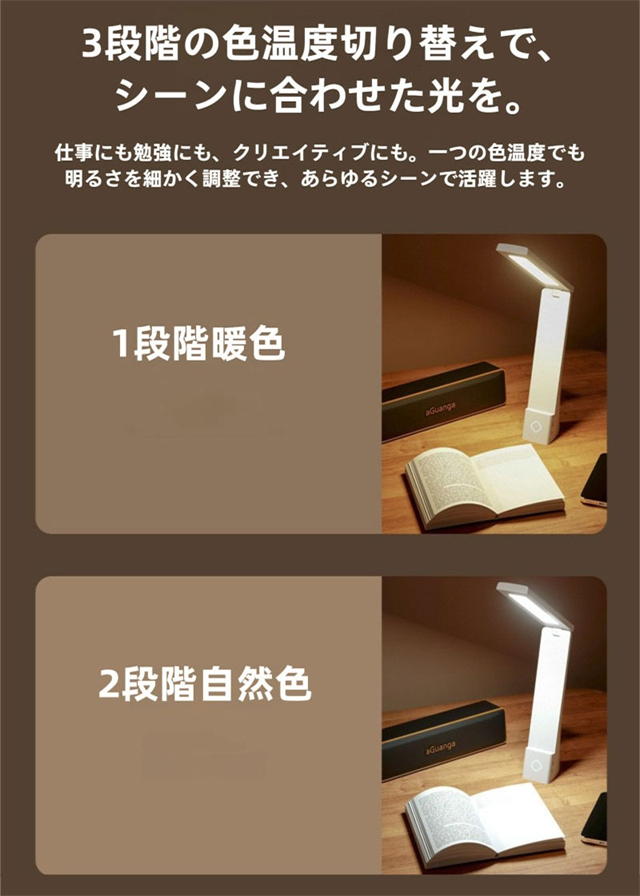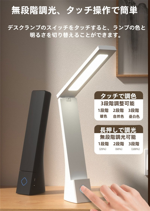 デスクライト スタンドライト テーブルランプ LED 折りたたみ USB充電式 充電・挿し替え両用 無段階調光 3段階調色 コードレス 持ち運び 明るい 目に優しい 調光調色 読書灯