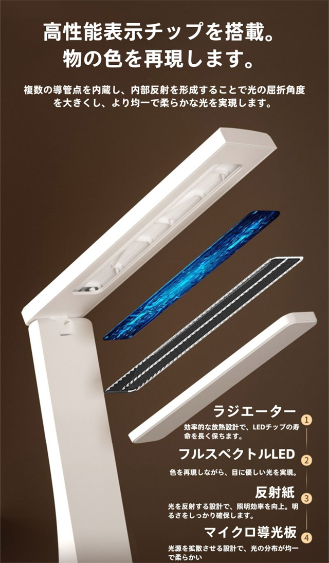 ・光の強さを無段階で調節でき、使用シーンに合わせて昼白色・自然色・暖色の3段階から光の色も調色できます。