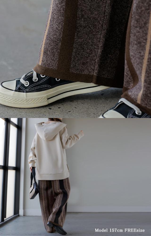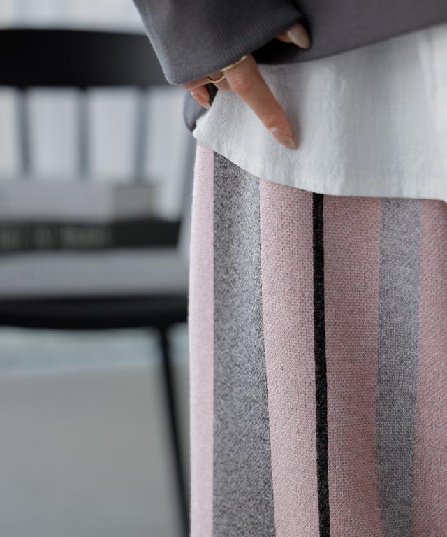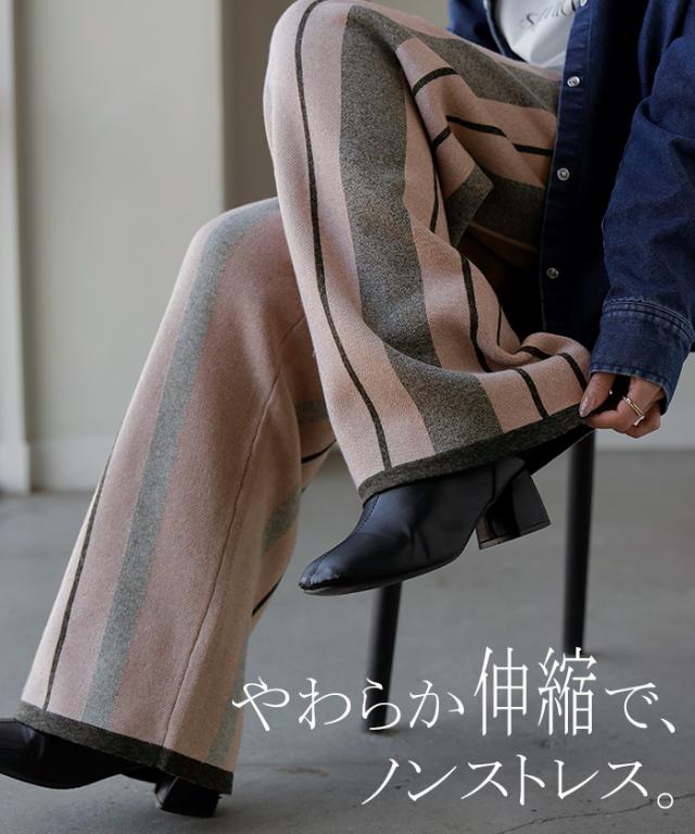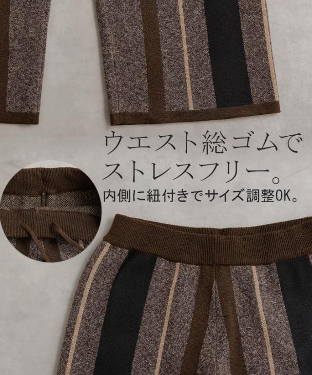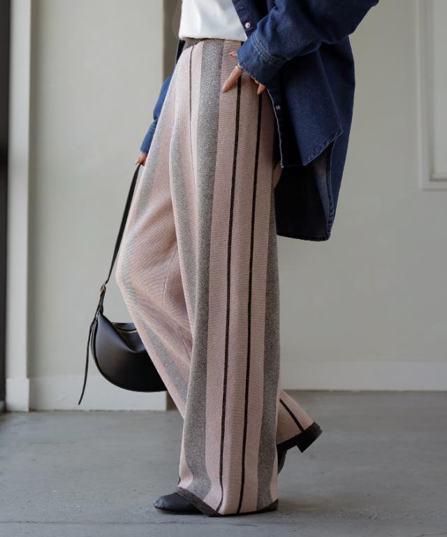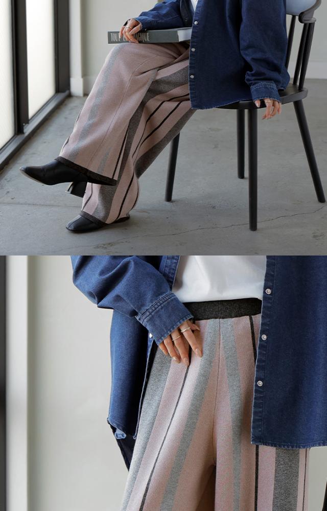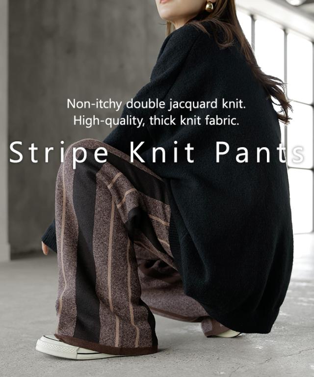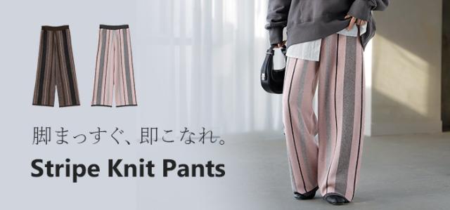 ニット生地を使用したすっきり見えするストライプ柄のパンツです。