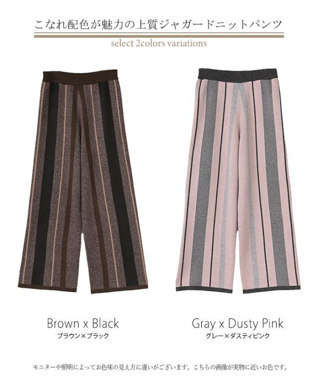 2025AW新作 パンツ ストライプ ニット 2月下旬入荷 ワイド レディース ニットパンツ ダブルジャガード ワイドパンツ ロング ロングパンツ 長い 体型カバー 総柄 ボトムス ボトム ストレート ゆったり ハイウエスト ストレッチ 美脚 大きいサイズ 黒 グレー 秋 冬 HUG.U