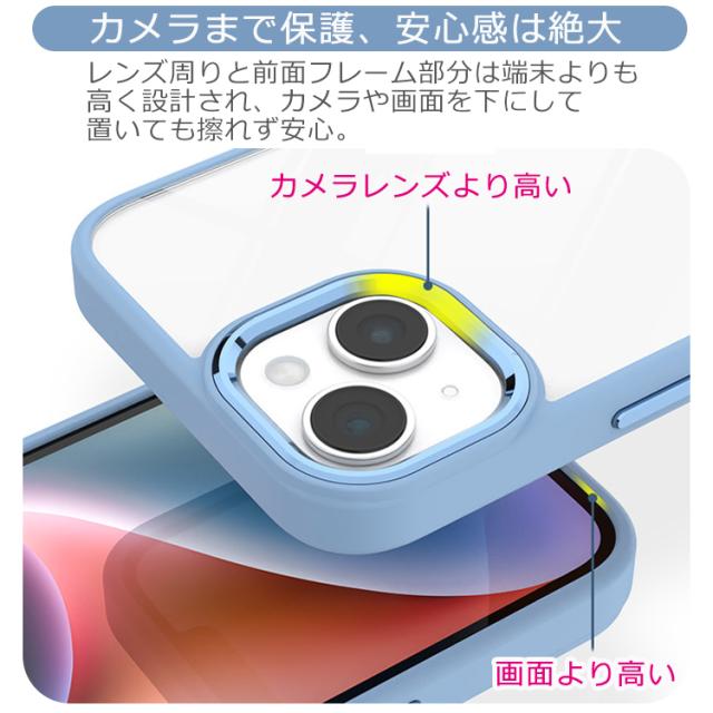 カメラレンズ周りと前面フレーム部分は端末より高く設計され、カメラや画面を下にして置いてもスクリーンが擦れず安心。 大切なiPhoneをしっかり保護。