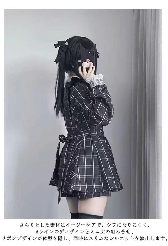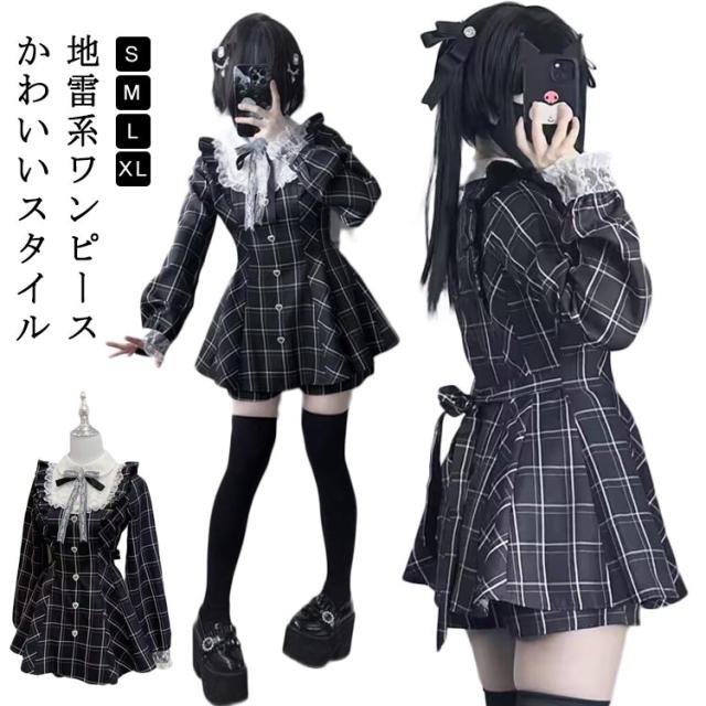 ワンピース 地雷系 レース フリル 長袖 量産型 チェック柄 痩せて見え ワンピース 病みかわいい ドレス ハイウエスト Aライン ワンピ 蝶結び 日系 可愛い レース ミニワンピース ギャル ロリータ 学院風 ミニ丈 お姫様 デート お出掛け 普段着