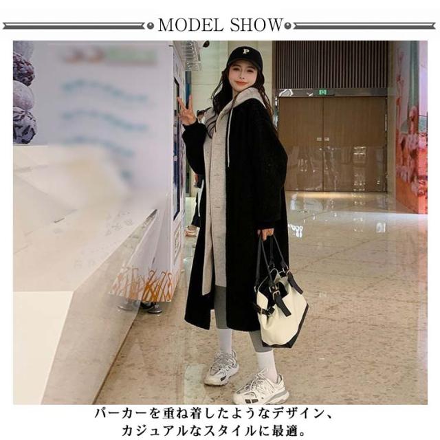 ロング丈 フード レイヤードボアコート 冬 フェイクレイヤード フード付きコート レディース フーディー ボアジャケット 保温 ボアパーカー 重ね着風 マウンテンパーカー フリースジャケット 防寒 秋 ジップアップ あったか カジュアル 着る毛布