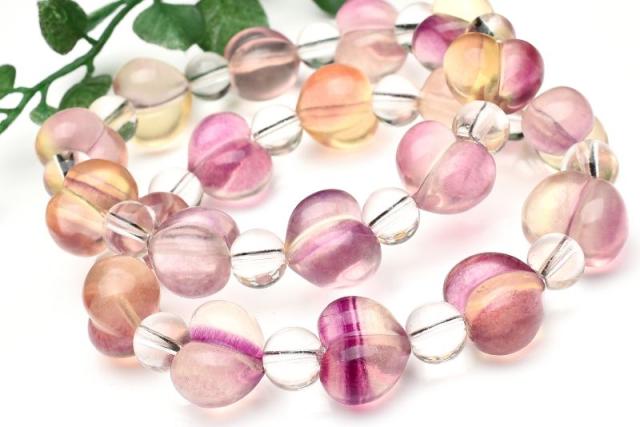 | 特徴・意味 | 可愛らしいハート型でバラしてハンドメイドのパーツにするのもおすすめです! フローライトは和名を「蛍石(ほたるいし)」と言い、加熱する、または紫外線を当てると光を発するという性質を持ち、このような性質から蛍石と呼ばれています。 その光を発するという現象はフローライトではじめて発見されたため、その螢光現象のことはフローレッセンスと呼ばれるようになりました。 英名のフローライトの語源は、ラテン語で「流れる」の意味を持つ「fluere」です。 フローライトは、紫、青、緑、黄、桃、無色などの透明感のある多彩な色を持ち、幻想的な石です。 1つの石が複数の色を持つバイカラーのものもあり、「レインボーフローライト」と呼ばれます。 |