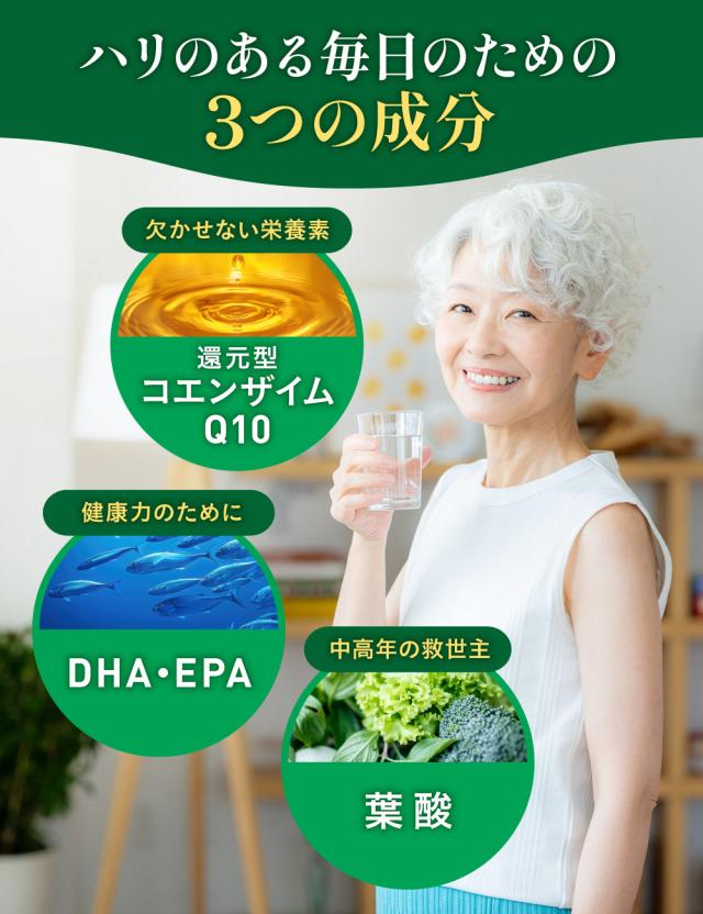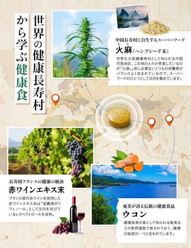 還元麦芽糖水飴(国内製造)、イチョウ葉エキス末、ウコン抽出物、ヘンプシード末、トランスレスベラトロール、レスベラトロール含有赤ワインエキス末、クルミ抽出物、大豆レシチン抽出物、ホヤ末、ピロロキノリンキノン二ナトリウム塩、バコパエキス末、還元型コエンザイムQ10、DHA含有精製魚油、マルトデキストリン、乳たんぱく質分解物(乳成分を含む)/セルロース、ステアリン酸カルシウム、二酸化ケイ素、葉酸、グリセリン脂肪酸エステル、酸化防止剤(V.E,V.C)、レシチン