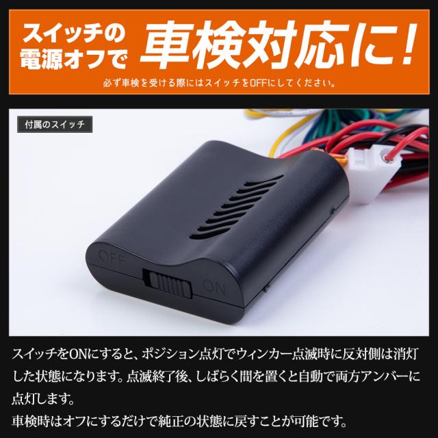 ウィンカー機能はそのままで、ポジションランプとして常時点灯します。 なので、他車からの認識性が大幅にアップ! 本製品を取り付けることでスモールランプ点灯時に連動してウィンカーランプが点滅ではなく常時点灯します。 ウィンカーを出した場合は通常通り点滅します。 純正ウィンカーを光らせるため純正のスタイルを損なわないのも魅力です。 ウィンカーポジションの電源そのものをオフすることも可能なので、車検時はスイッチをオフにするだけで純正の状態に戻すことが可能です。 |