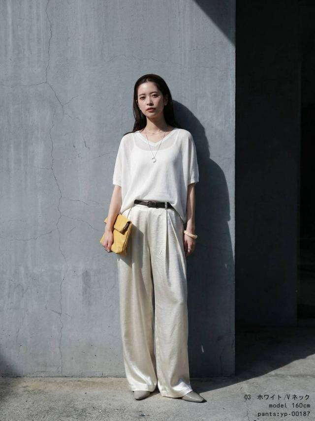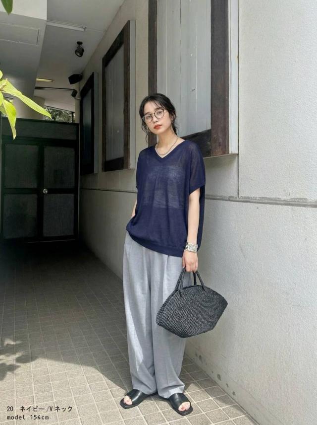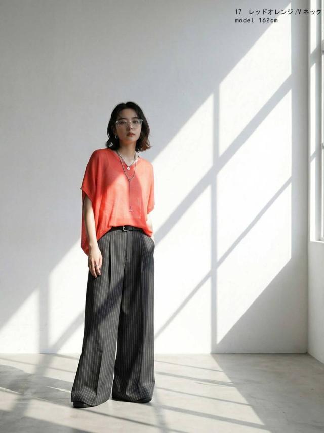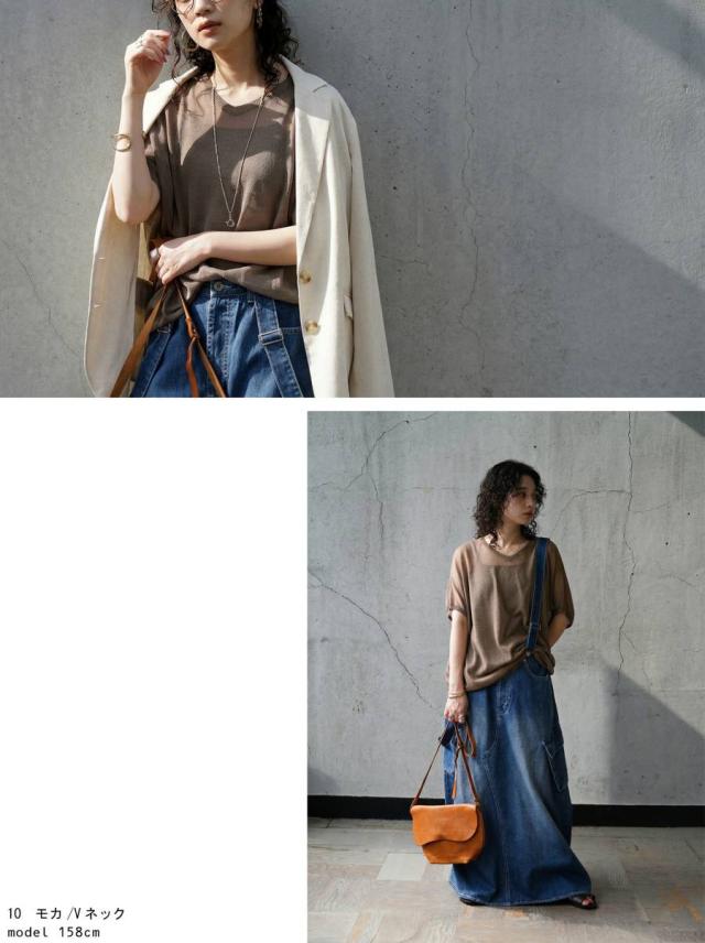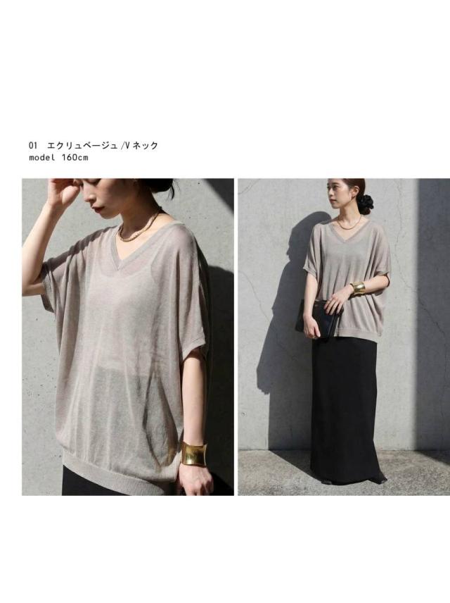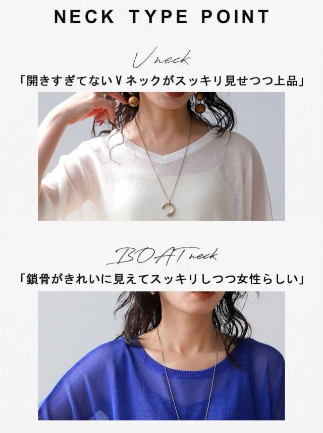 ネックラインはVネックとボートネックの2タイプから選べ、顔まわりをすっきり見せます。