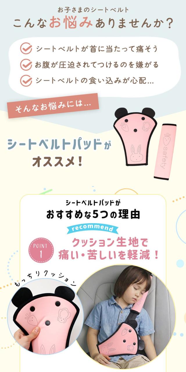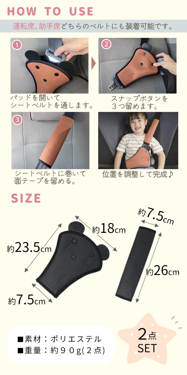 胸当てパッドはシートベルトを通してスナップボタンをとめるだけ、ロングパッドはベルトに巻き付けて面ファスナーで留めるだけの簡単取り付け。工具いらずで位置調整もしやすく、日常使いしやすい設計です。かわいいキッズ用カー用品として、お子さまの「ベルトいや!」という気持ちをやわらげ、けが防止を意識しながら楽しくドライブしたいご家庭にぴったりです。