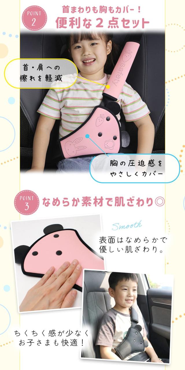 シートベルト/カバー/パッド/2点セット/締め付け防止/枕/クッション/食い込まない/首/肩/擦れ/圧迫感解消/かわいい/キッズ/男の子/女の子/柔らか/チクチクしない/快適/ドライブ/旅行/車内/助手席/レザー風/おしゃれ/簡単取り付け/スナップ/面ファスナー/うさぎ/ニンジン/子供/うたた寝/おなか/首周り/お腹/腹部/幼児/セーフティ/カー用品/けが防止/車内コーデ/