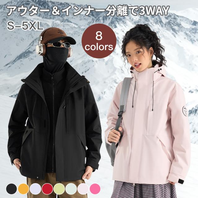 スキーウェア 3WAY ウェア アウター & インナー分離 冬季厚手保温 防?撥水加工 大サイズ S-5XL 8 カラー展開 カップル用 スキー スノーボード 冬季登山 日常外出 洗濯機対応 耐久性優れる 送料無料