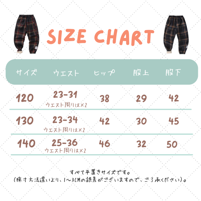 120cm:ウエスト23-31cm ヒップ38cm 股上29cm 股下42cm 裾幅11-13cm