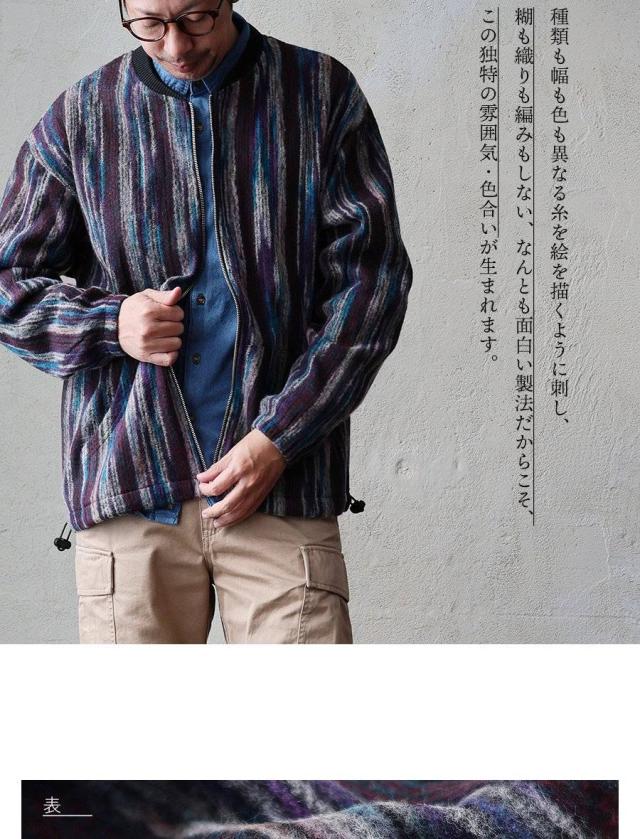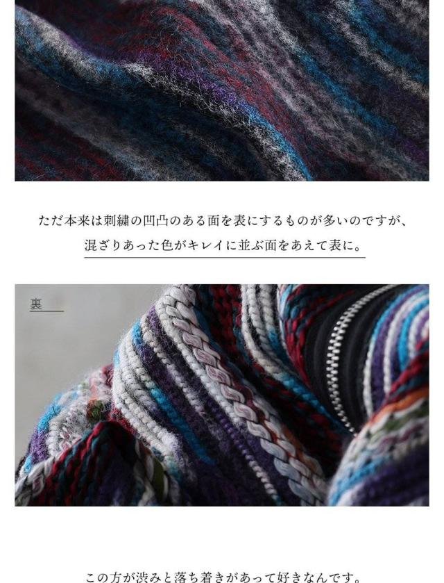 ・種類も幅も色も異なる糸を絵を描くように刺し、糊も織りも編みもしない、なんとも面白い製法だからこそ、この独特の色合いが生まれます。