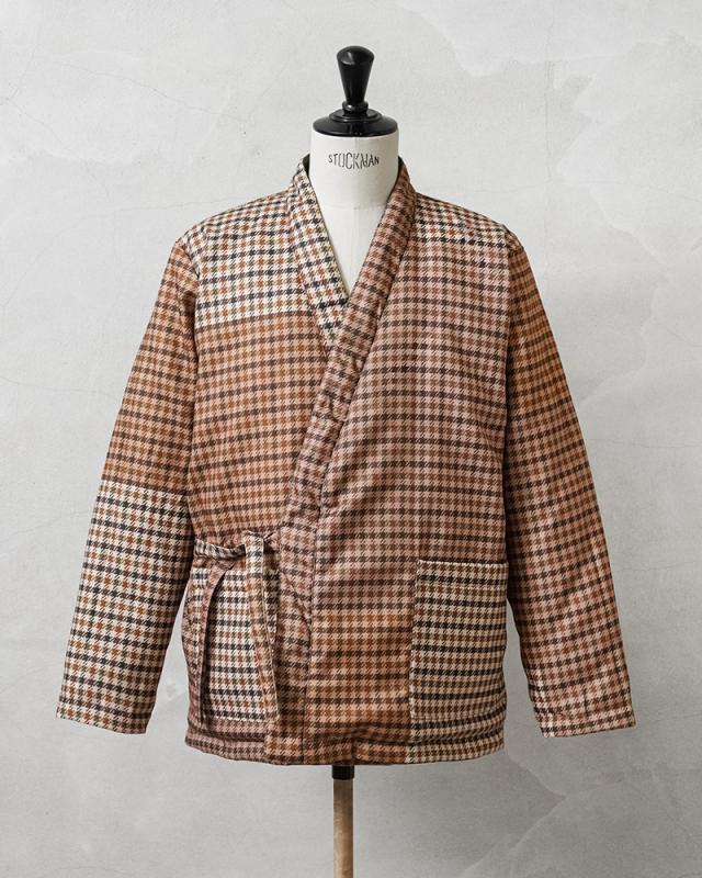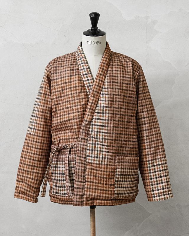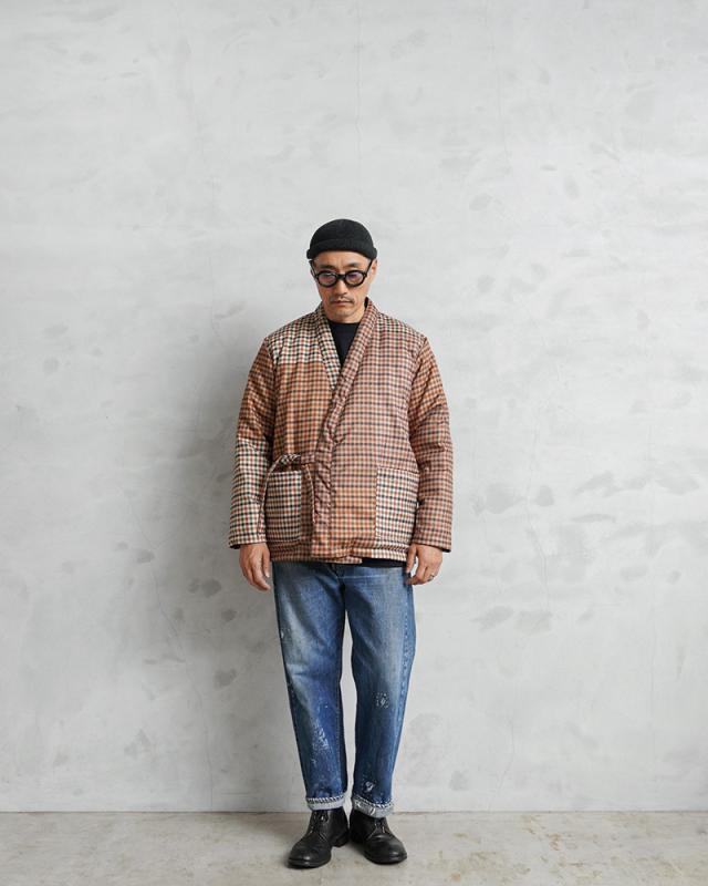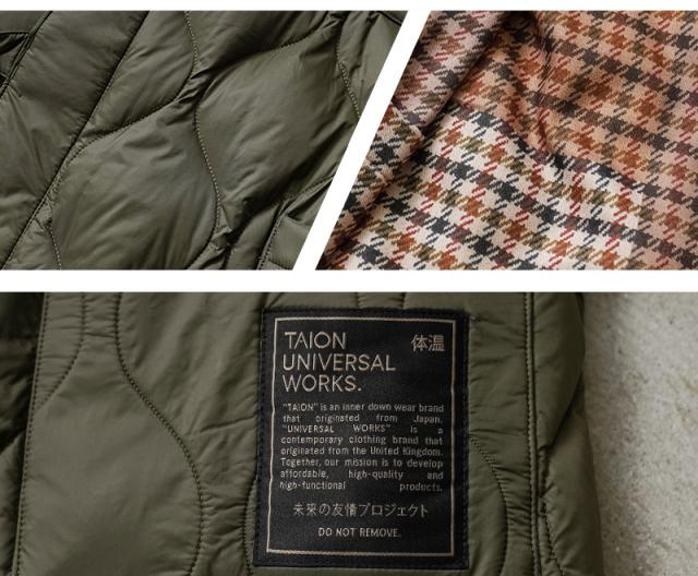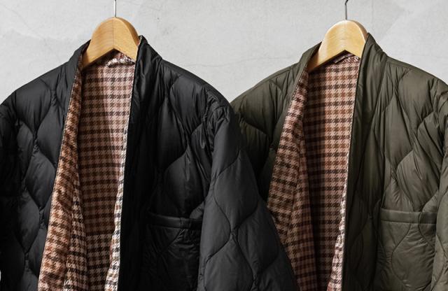 生地の表面には、撥水加工をかけることで汚れがつきにくく、裏面にはダウンが吹き出しにくいACコーティングを施すなど、カテゴリーや商品用途に合った、最適な生地を選択し採用するTAIONから、上品さと機能性を兼備したUNIVERSAL WORKS × TAION リバーシブル袢纏ダウンが登場しました。Universal Works(ユニバーサルワークス)はイギリスでデザイナーのデヴィッド・キート氏が立ち上げた、ワークウェアやミリタリー、アウトドアウェアの要素を取り入れた現代的なファッションブランド。一般で使用されるダウン(600フィルパワー前後)よりも軽く、暖かい空気をたくさん含むことができ、軽くて弾力のある800フィルパワーのダウンを採用。 表面はTAIONの定番デザインを踏襲し、裏面にはクラシックなガンクラブチェックプリント、1枚で2つの表情を楽しめるリバーシブル仕様になっています。