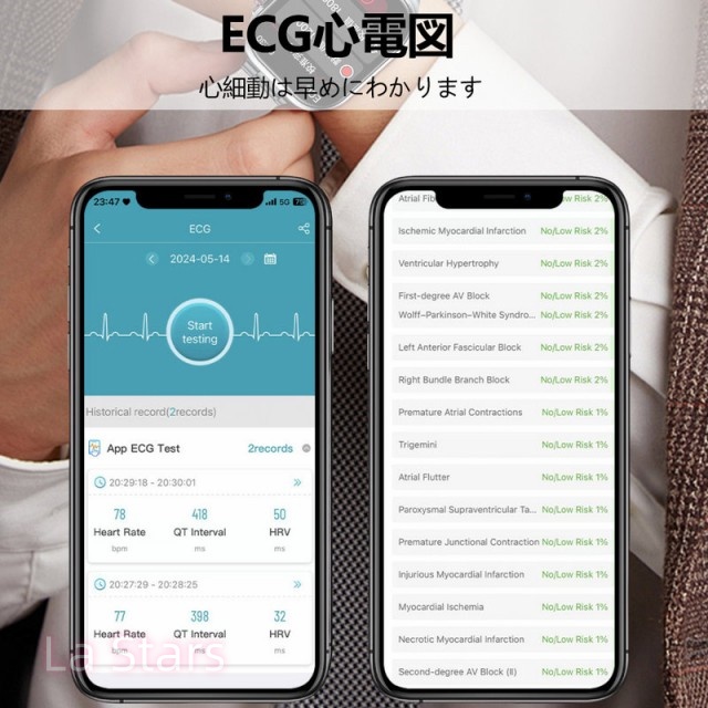 ・健康管理:SOS機能、体組成検査、心電図、体温監視、血圧測定、血中酸素、心拍計、活動量計、歩数計、音楽制御、座りがちの自動注意、睡眠モニター、運動モニター、スポーツ、カメラ操作、カロリー、睡眠の質と時間及び日常生活のさまざまなシーンで測定ができます。
