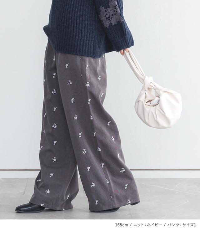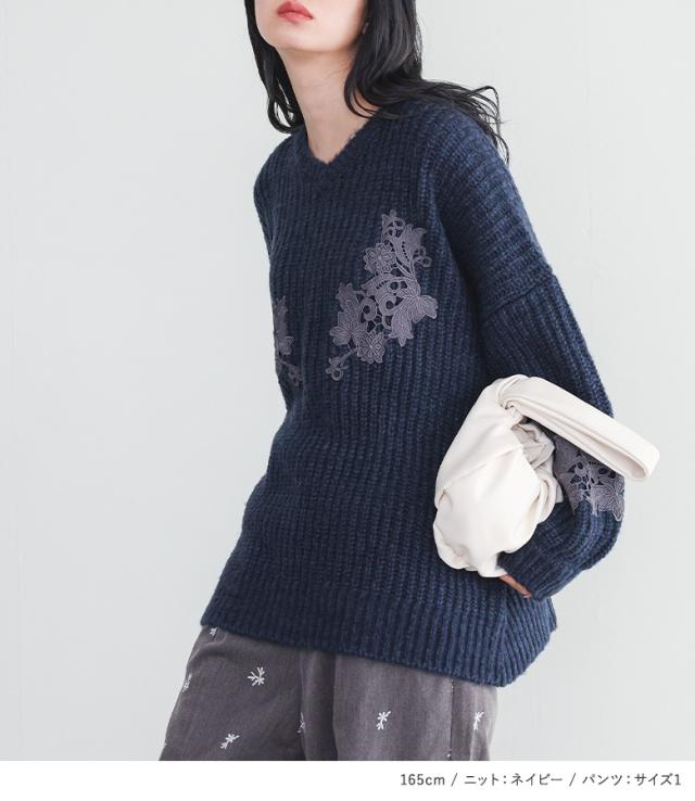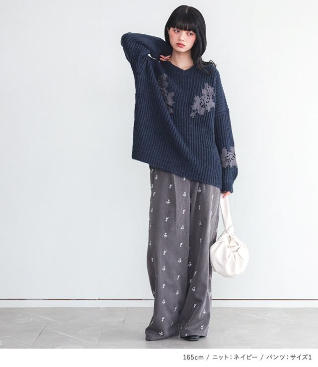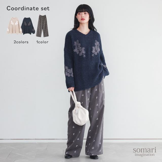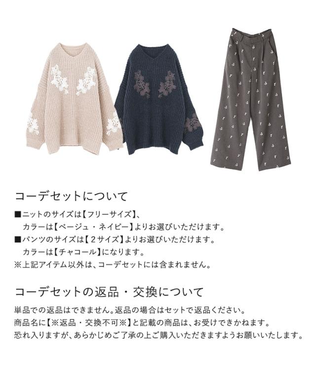 【送料無料】『モチーフレースモヘヤタッチ畦ニット×花柄刺繍スラックスコーデ2点SET』【メール便不可】【50】[2点コーデセット 2025 レディース ニット トップス セーター Vネック パンツ ボトムス スラックス]