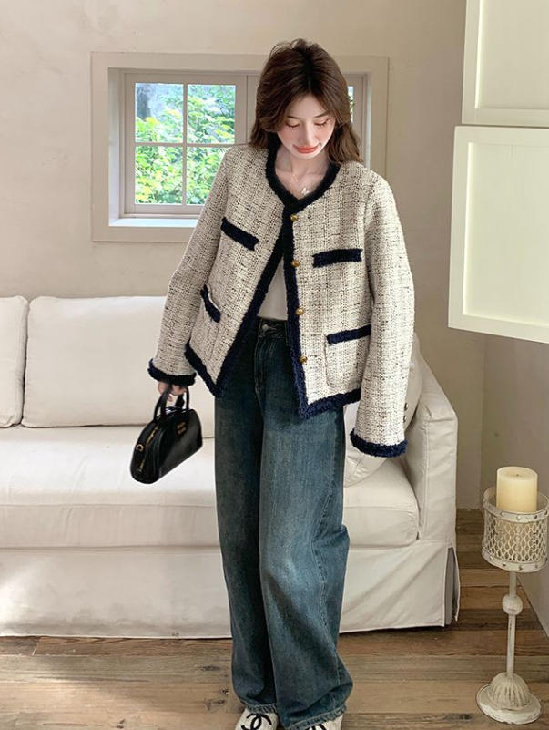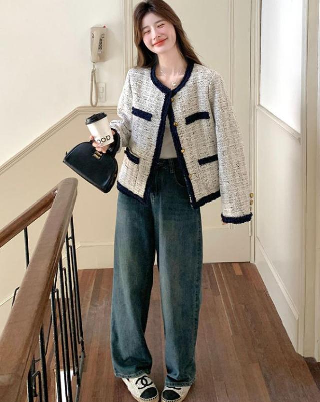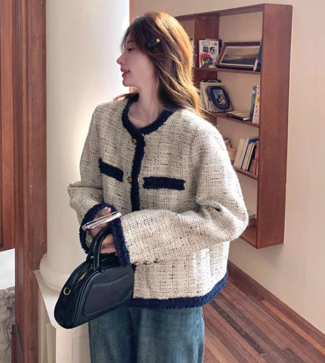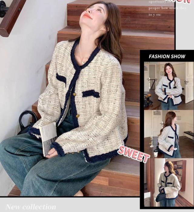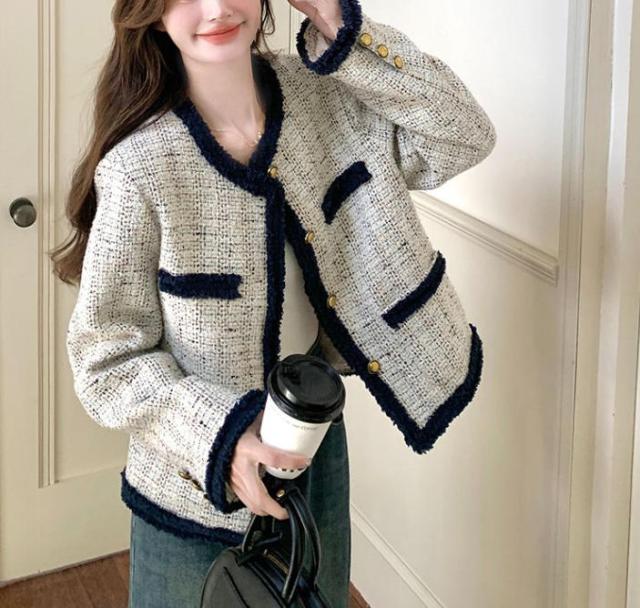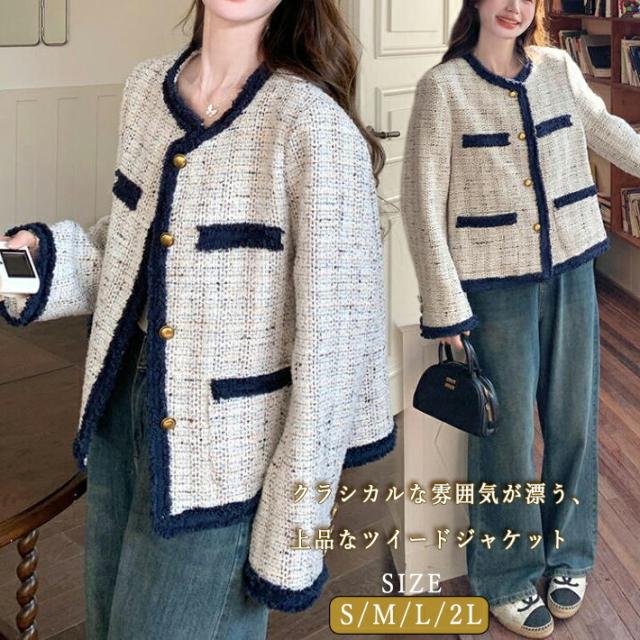エレガント ツイード ジャケット レディース ノーカラー アウター 羽織り コート 金ボタン 配色 パイピング アウター きれいめ 冬 フォーマル 通勤 デート 入学式 卒業式 春 秋 S M L 2L