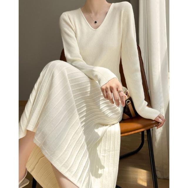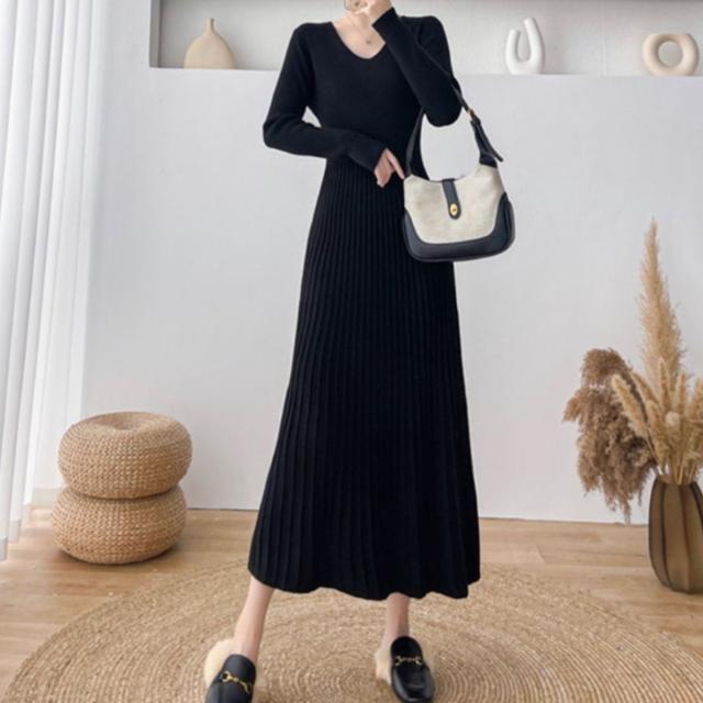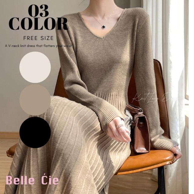 ニット ワンピース ニットワンピ リブ Vネック ロングワンピース レディース 韓国ファッション きれいめ 大人カジュアル シンプル おしゃれ 長袖
