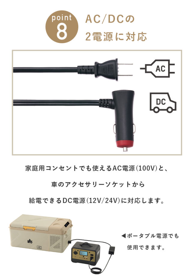 構成:本体、ACケーブル、ACアダプター、DCシガーソケットケーブル