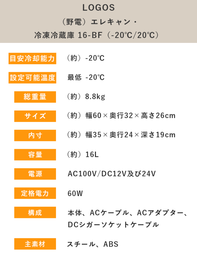 【正規販売店】 LOGOS ロゴス エレキャン・冷凍冷蔵庫 16-BF(-20℃/20℃) 74175097 冷却 保冷 コンパクト 車中泊 アウトドア キャンプ