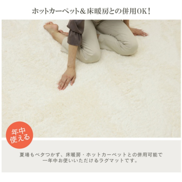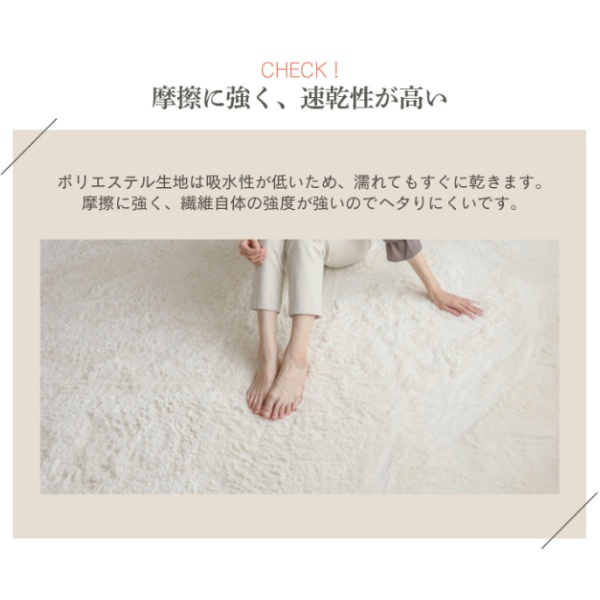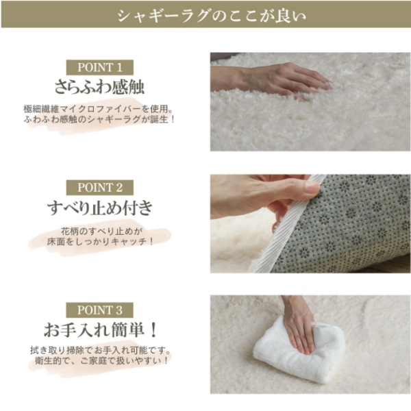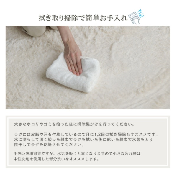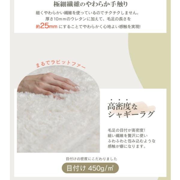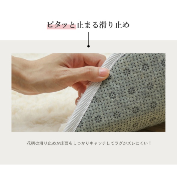 ● 長毛でやわらかく、手触りの良いラグです。毛足の長さは約3cm。 ● 裏面には滑り止め加工を施しており、転がしてもずれにくく、安定してお使いいただけます。 ● お手入れが簡単で、軽い汚れは部分洗いが可能です。日常のお掃除には掃除機をご使用ください。 ※※ 掲載写真はできる限り実物の色味に近づけておりますが、ご使用のブラウザやモニター環境により、実際の商品と多少色味が異なる場合がございます。あらかじめご了承ください。