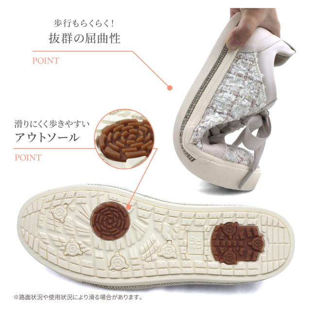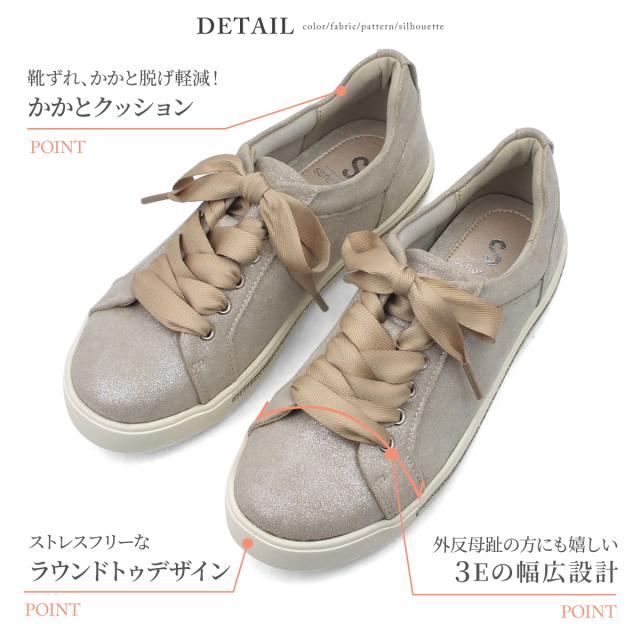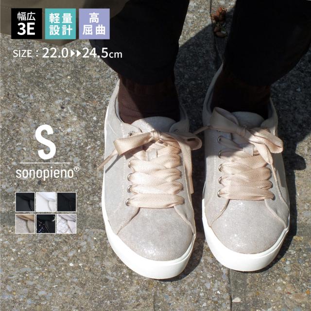 sonopieno-ソノピエーノ- “ソフトな足あたりと履き心地"がコンセプト。とっても軽い履き心地軽量レースアップスニーカーです。ソールにビジューの飾りを付けキラリと光るアクセントをプラス、3Eの幅広設計で外反母趾や幅広の方でも安心してお履き頂けます。高反発クッションインソールは歩行時の疲れを軽減!さらに取り外し可能なので靴を清潔に!履き口周りには厚みのあるクッションが入っているので足あたりがよく足を優しく包み込みしっかり固定しながらもソフトな履き心地!まるで履いていないかのような軽量設計で疲れにくいです!さらに屈曲性抜群のしなやかで反りの良いアウトソールなので歩行がとても滑らか!しっかりとした凸凹のアウトソールは地面をしっかりと踏みしめれれ、体重がかかりやすい部分には別素材のゴム素材を使用しグリップが効いて滑りにくく安心して歩けます。