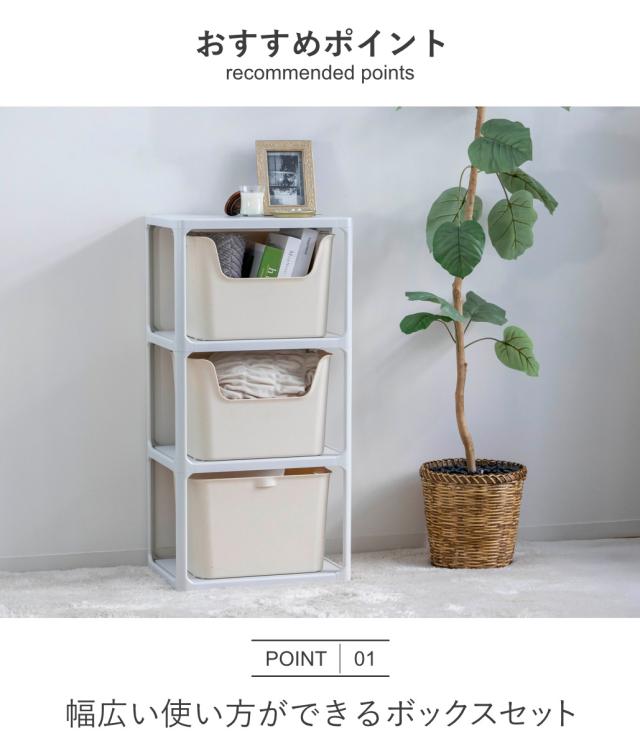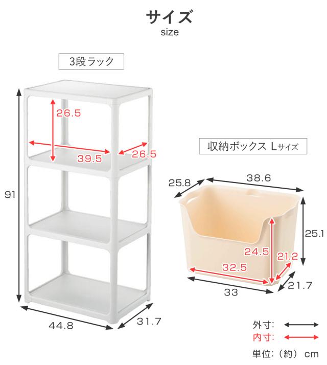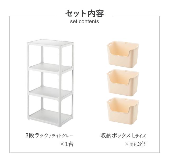 | 内容量 | 【セット内容】 ・3段ラック×1台 ・収納ボックス L×同色3個 |
