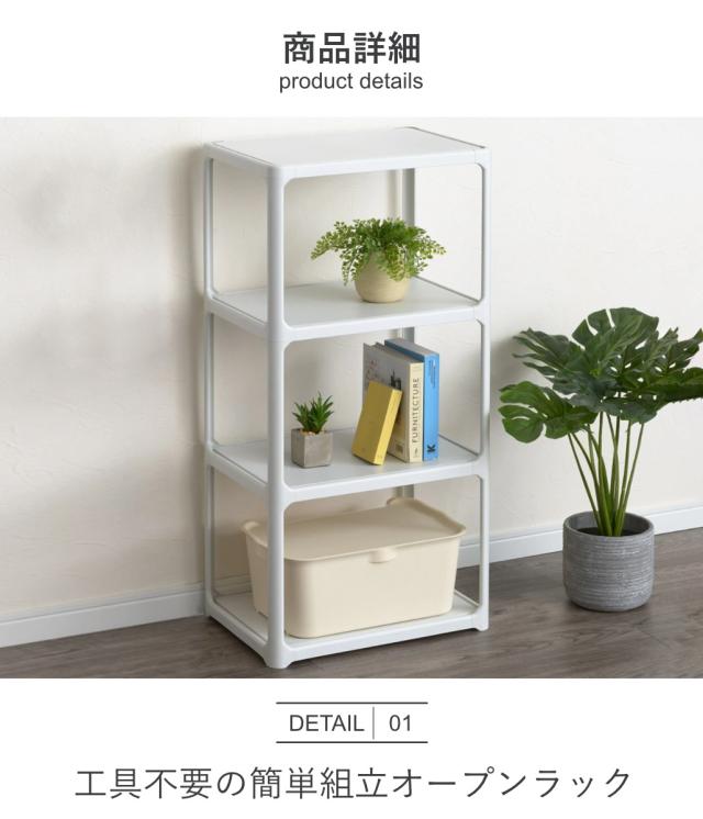 3段ラックは、工具不要でパズルのように簡単に組み立てられます。どの面もオープンになっているため、縦置き・横置きどちらでも、好きな角度から目当ての物をサッと取り出せます。正面に回り込む必要がなく、ストレスなく使える仕様です。