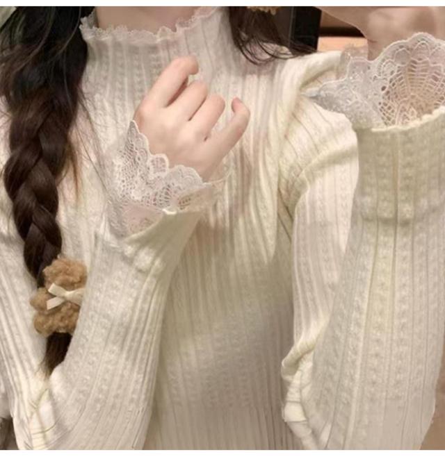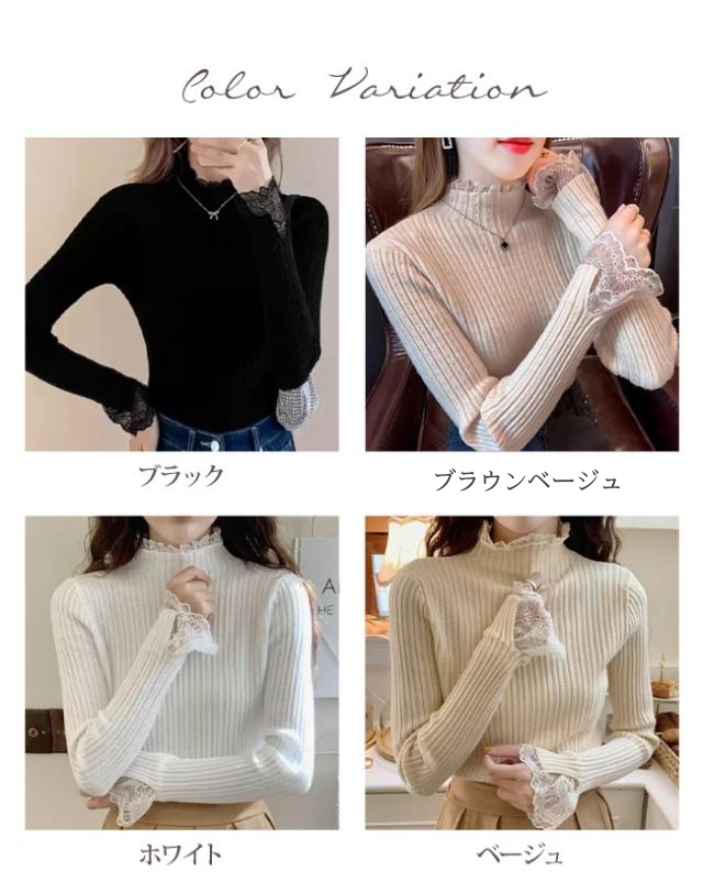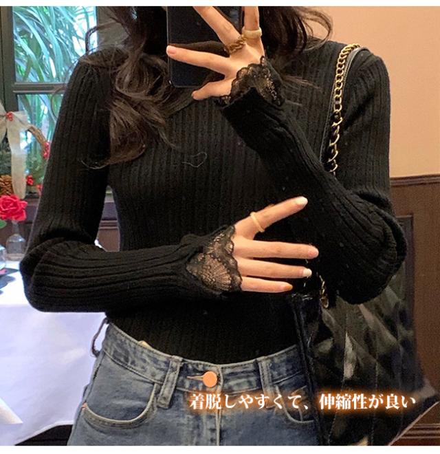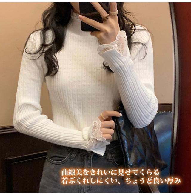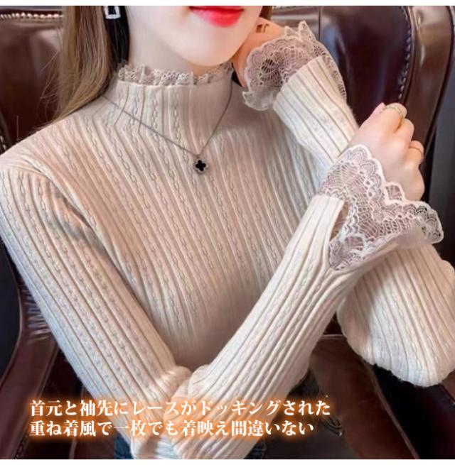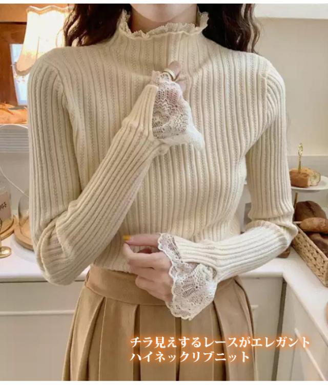 HOTワード:ニット 袖レース ハイネック トップス 長袖 レディース 重ね着風 フレア袖 レースニット カットソー リブニット フリルネック フィット ニットセーター 柔らかい 可愛い 着痩せ 体型カバー 秋冬 春 おしゃれ 送料無料