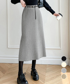 ワイドリブ プリーツスカート ベルト付きミモレ丈スカート 体型カバーオフィスカジュアル ロングスカート 美脚脚長 着やせエレガントスカート 暖かいスカート無地 大人きれいめ 上品