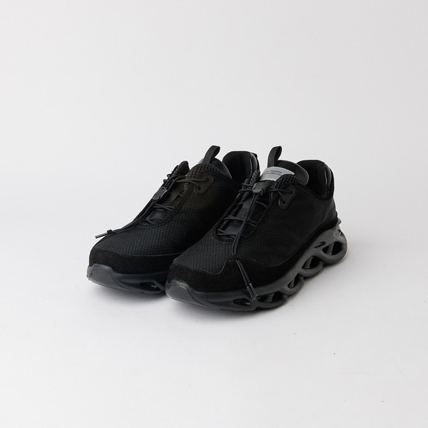 Y3Kトレンドをイメージしたレースアップスニーカー。透け感のあるアッパーに対し、メッシュ地や別パーツのシューホールマットガードがさりげなくギミック感を演出。素材を幾重にも重ねることで、トレンドの強い現代の服装にも違和感なくマッチします。シューレースは結ぶこと無くアジャスターで簡単にホールド、リリースができます。ボリュームあるデザインですが、片足約300gと軽くて履きやすいのもポイント。