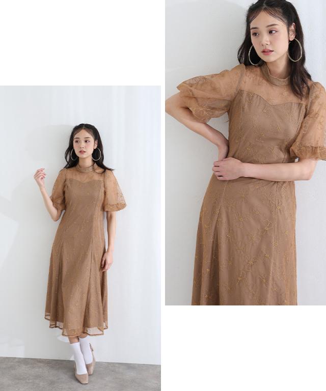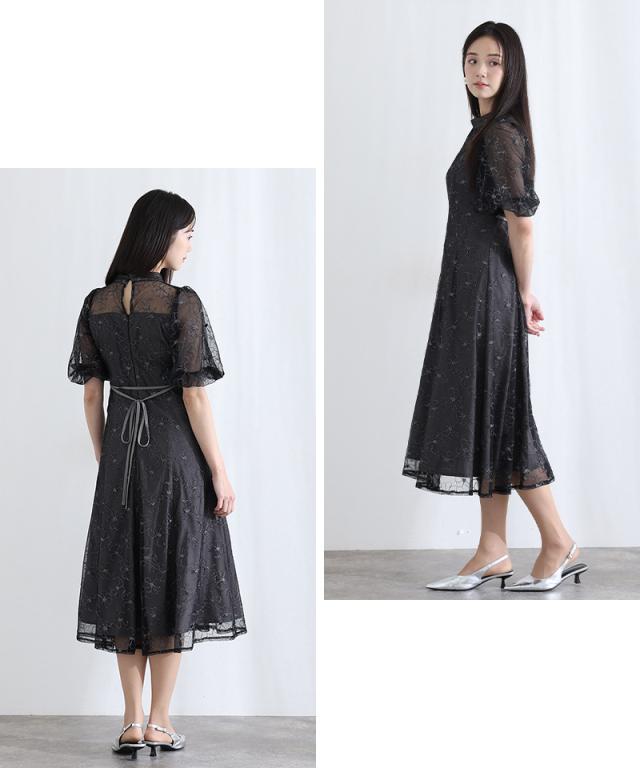 胸元はシアー切り替えを採用し、デコルテラインを美しく演出しながら華やかすぎない抜け感をプラス。