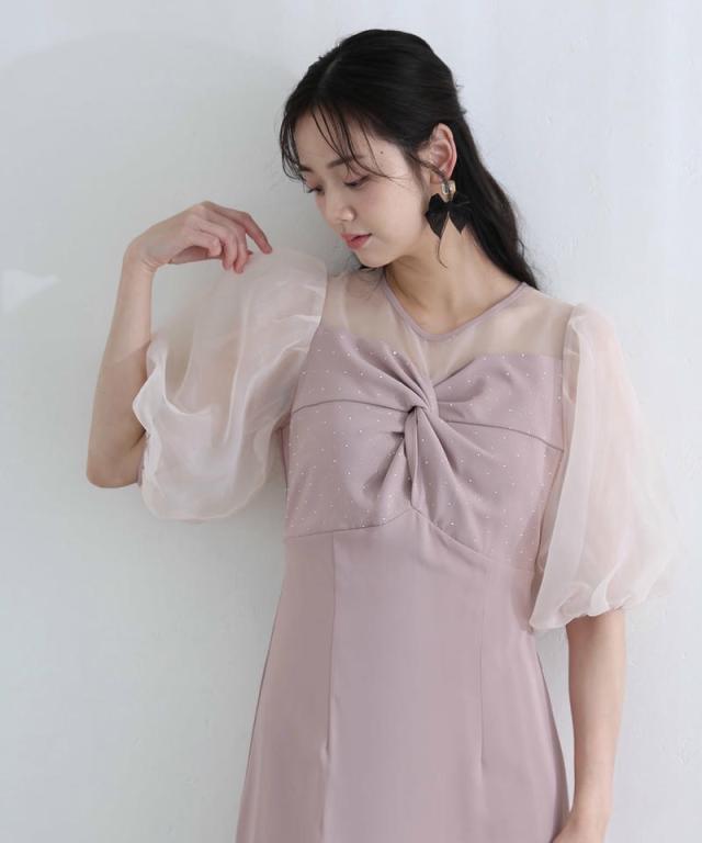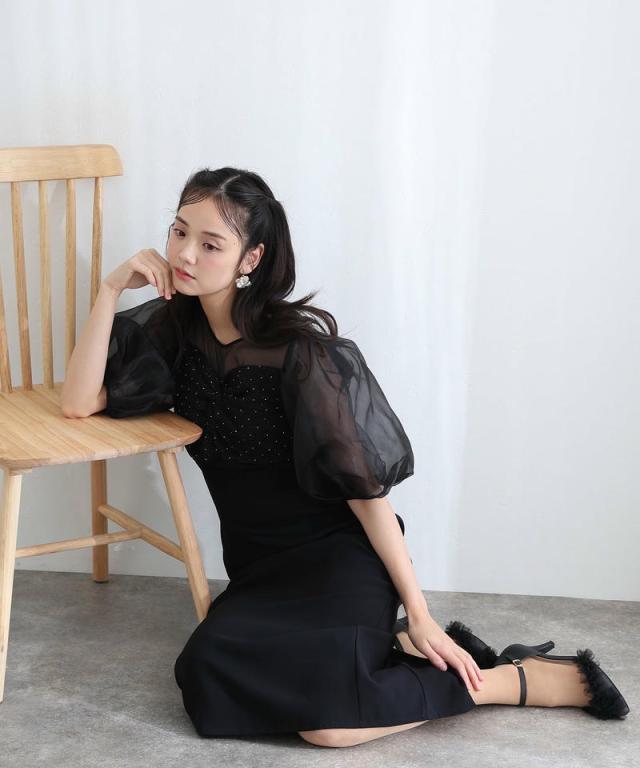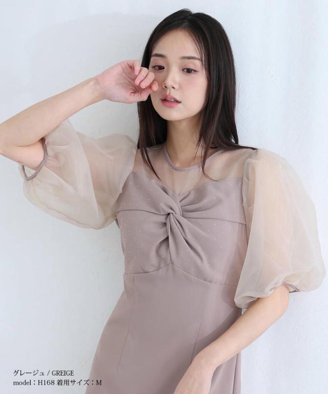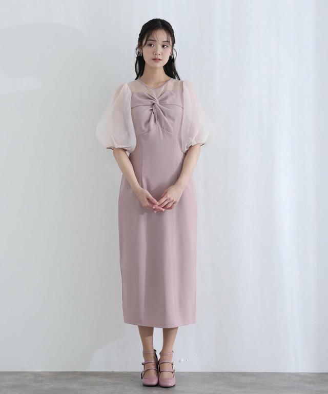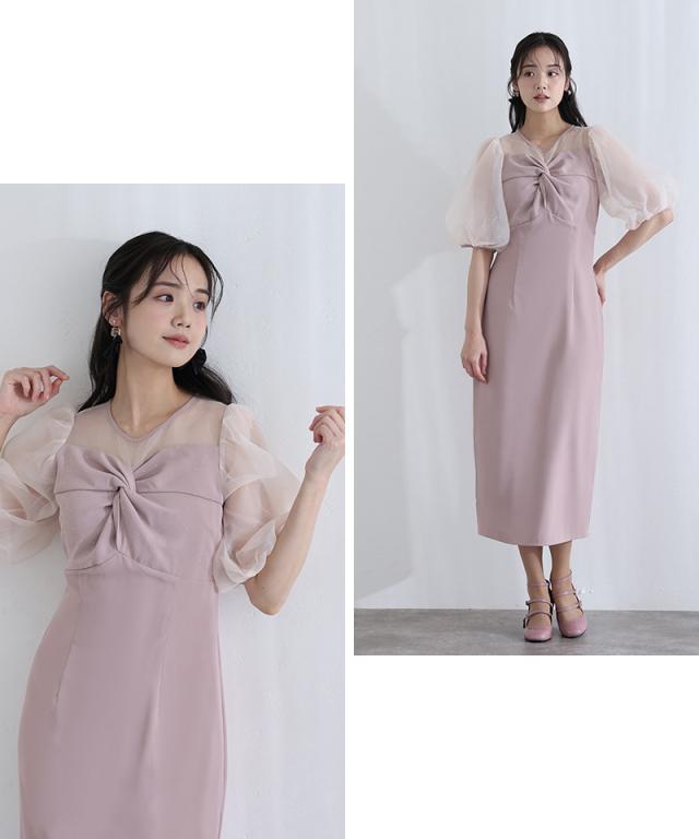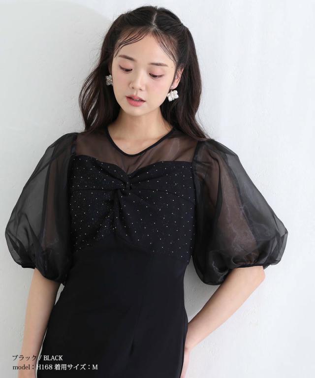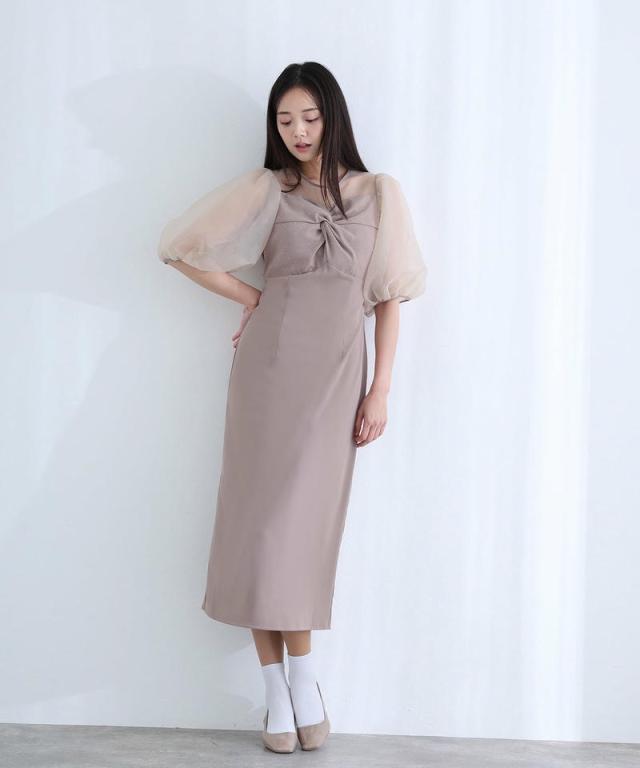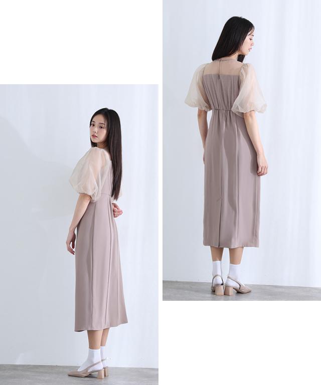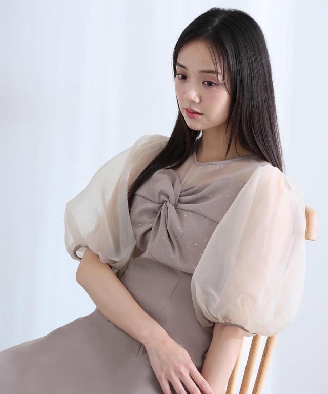 柔らかく膨らむオーガンジーのパフスリーブが、視線を自然に上へと誘導しスタイルアップを叶えます。