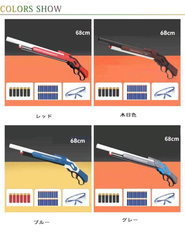 | サイズについての説明 | 商品内容:本体*1、薬莢*6、スポンジ弾丸*20、保護メガネ*1 長さ:約68cm ※商品のサイズは手作業で測定させて頂いておりますので、若干の誤差があります。 |